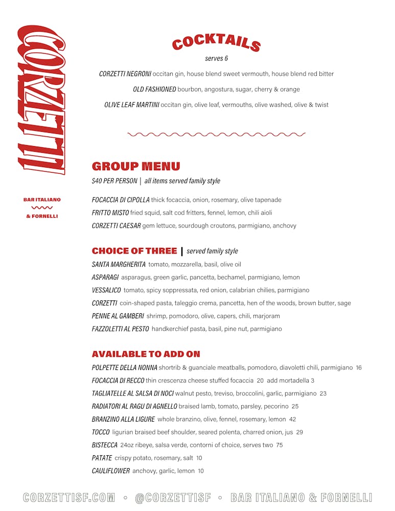 The group menu is a great way to enjoy your time at Corzetti without overcomplicating things. It offers our guests a choice of our most popular items, plus the option to add from our regular menu a la carte if they'd like to supplement the offering, so everyone leaves happy.